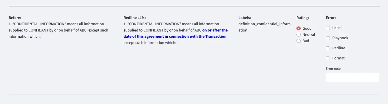 To support this, we invest in developing internal tools that ensure structured, high-quality annotation. For example, we’ve developed multimodal annotation apps for signatures and other contract elements, as well as tools that integrate textual annotation seamlessly with our processing pipeline to ensure that our data is as precise and objective as possible. During our annotation processes we also heavily invest in peer review of gold-standard datasets, such as a multi-contract chat experience comprising over 8,500 samples, through a “four-eye” process whereby annotations are reviewed and approved by more than one team member.