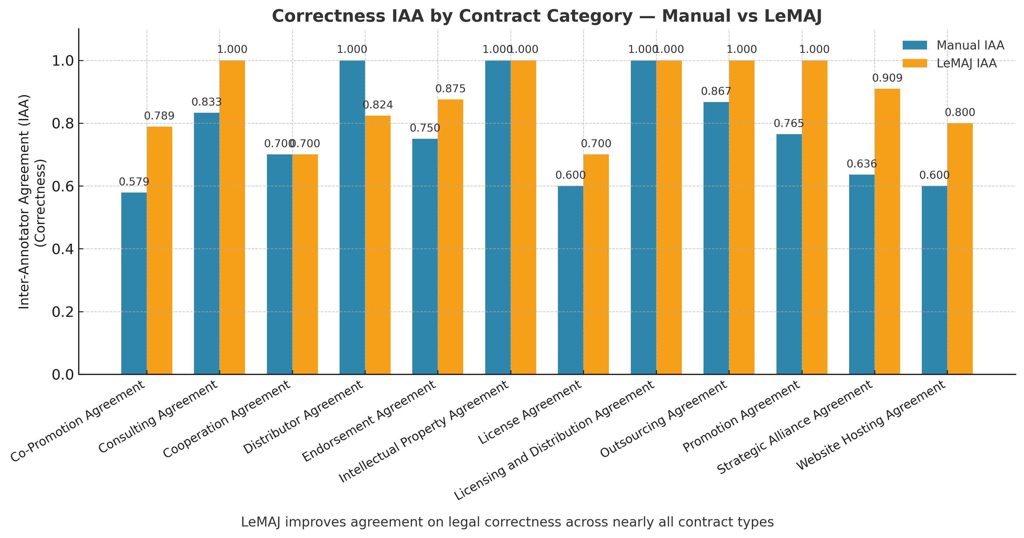 Alongside acting as a powerful tool for autonomous evaluation, one of the core strengths of the LeMAJ methodology lies in the ability of Legal Data Points to not only improve correlation between automatic evaluation and human evaluation but also correlation between humans. Legal questions often involve judgment calls and interpretation - two experienced lawyers can reasonably reach different conclusions on the same issue. But the LeMAJ methodology has improved inter-annotator agreement when looking at answer correctness by 11%, addressing a critical issue in the development of high-quality reference data and for the effective evaluation of assessment methods.